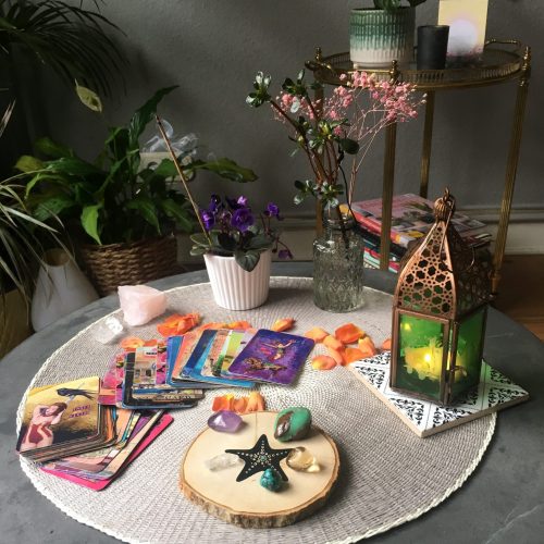 Creating a sacred place before reading your cards with crystals, flowers and candles